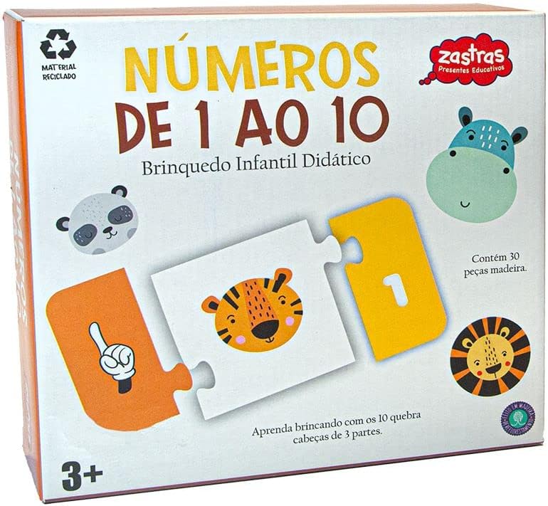 1, 2, 3, 4... vamos aprender a contar até 10! Para cada número, temos um quebra-cabeça de 3 partes, com representações diferentes do número: o numeral, com as mãos, e os bichinhos demonstrando a quantidade.